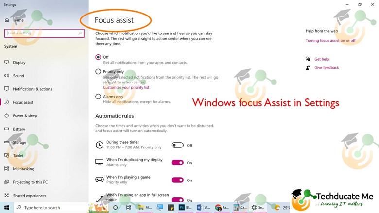 By selecting Focus aid under Start, Settings, System, you can change its settings (or just search for it). You can make rules and set priorities in this area, such as specifying times when you don't want to be disturbed.